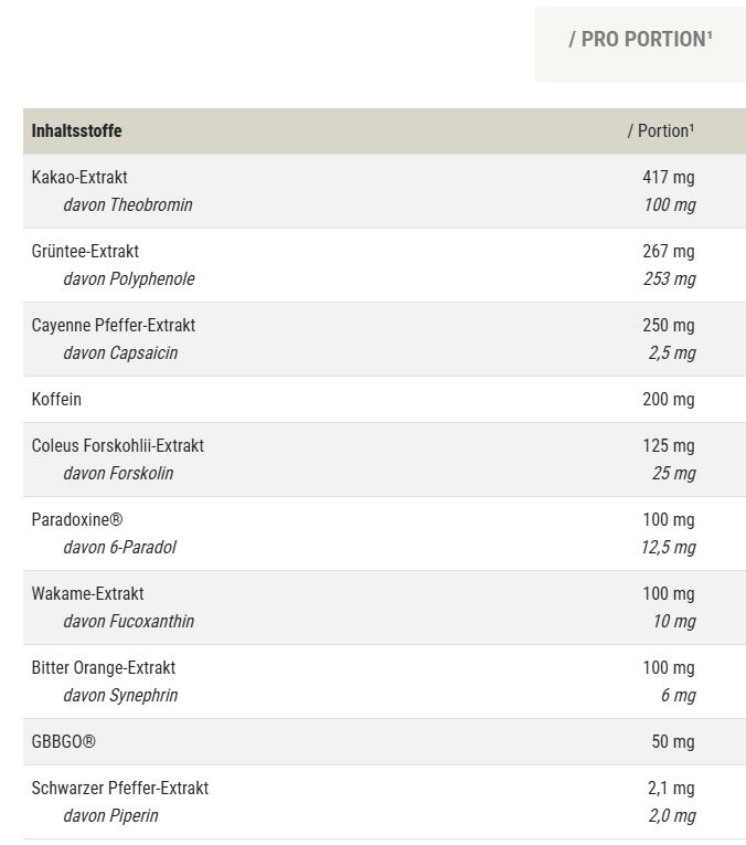 Kakao-Extrakt (Frucht), Grüntee-Extrakt (Blatt), Cayenne Pfeffer-Extrakt (Frucht), Koffein, Kapselhülle (Hydroxypropylmethylcellulose), Coleus Forskohlii-Extrakt (Wurzel), Paradieskörner-Extrakt (Samen) (Paradoxine®), Wakame-Extrakt (Blatt), Bitter Orange-Extrakt (Frucht), Gamma-Butyrobetaine Hydrochlorid (GBBGO®), Trennmittel (Magnesiumsalze von Speisefettsäuren), schwarzer Pfeffer-Extrakt (Frucht).
