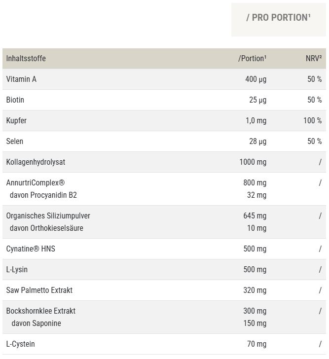 Kollagenhydrolysat, Annurca Apfel Extrakt (AnnurtriComplex®) (Frucht), Kapselhülle (Rindergelatine), organisches Siliziumpulver, L-Lysin HCl, Keratinhydrolysat (Cynatine® HNS), Saw Palmetto Extrakt (Frucht), Bockshornklee Extrakt (Samen), L-Cystein, Tri-Calciumphosphat, Trennmittel (Magnesiumsalze von Speisefettsäuren, Calciumsalz der Orthophosphorsäure), Natriumselenat, Retinylacetat, Kupfersulfat, D-Biotin.