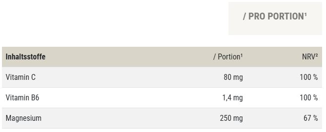 Magnesiumsalze der Citronensäure (40 %), Säuerungsmittel (Citronensäure, Apfelsäure), Inulin, Natriumbicarbonat, Aroma, Ascorbinsäure, Süßungsmittel (Acesulfam-K, Sucralose), Farbstoff (Karmin-Extrakt), Pyridoxinhydrochlorid.