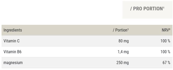 Mixmagnesium salts of citronic acid (40 %), acidic acid (citric acid, apple acid), inulin, sodium bicarbonate, aroma, ascorbic acid, sweetener (acesulfam-k, sucralose), dye (carmine extract), pyridoxin hydrochloride.