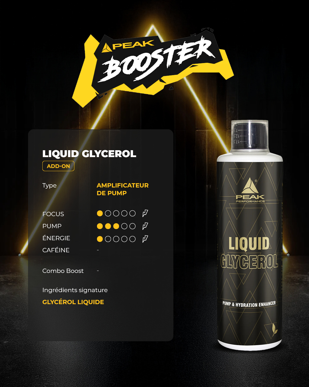 Liquid Glycerol n’est pas un booster “à lui seul” : c’est un renfort à ajouter à ton pré-workout (ou à un pump booster) pour pousser la congestion et l’hydratation musculaire. Parfait si tu veux upgrader un stack sans augmenter la caféine.