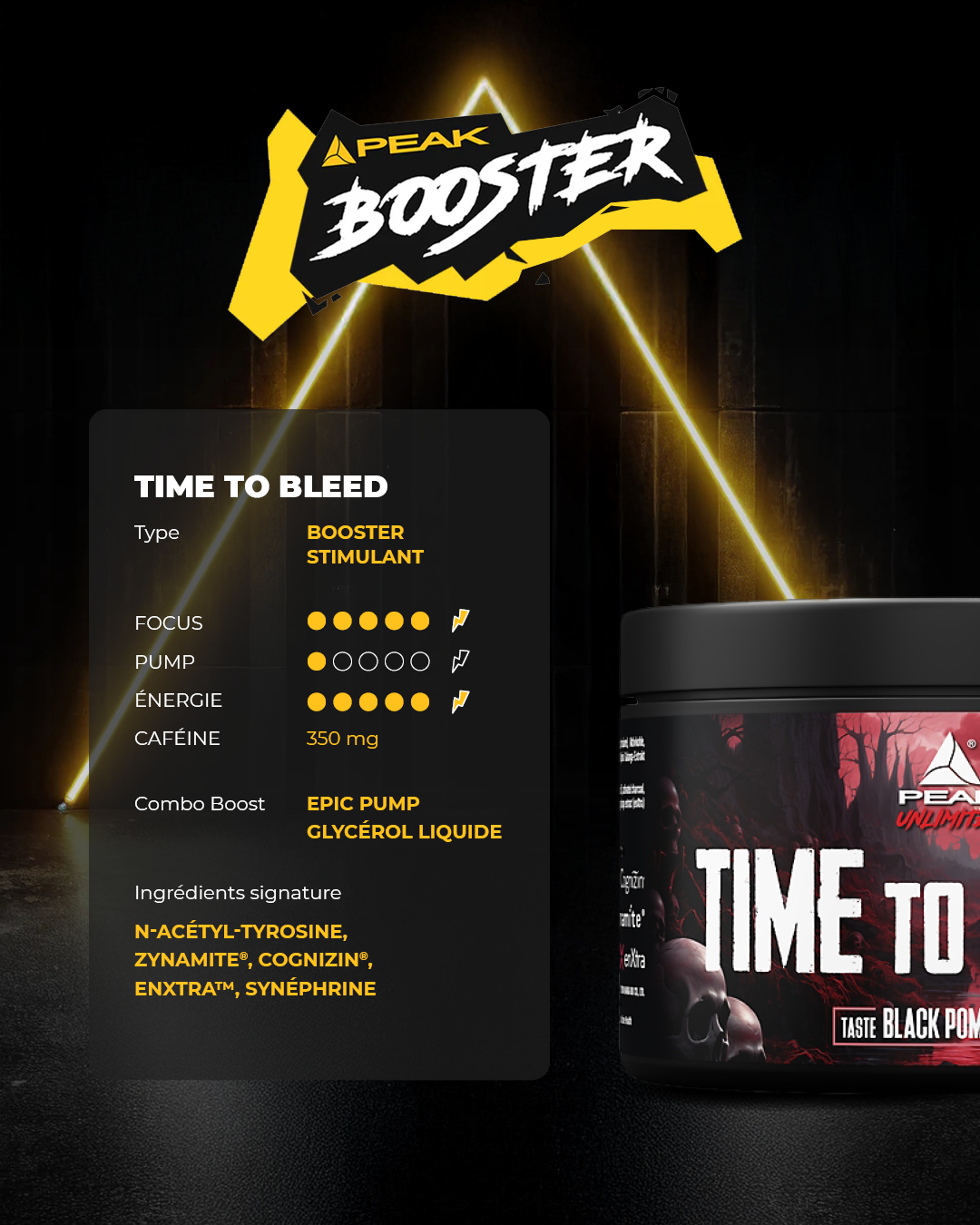 Time To Bleed est conçu pour un tunnel focus très marqué et a été développé pour se combiner parfaitement avec Epic Pump : tu peux donc garder le pump “propre” d’un côté et la stimulation/focus de l’autre, selon ton objectif du jour.