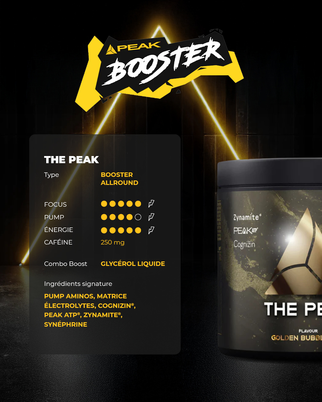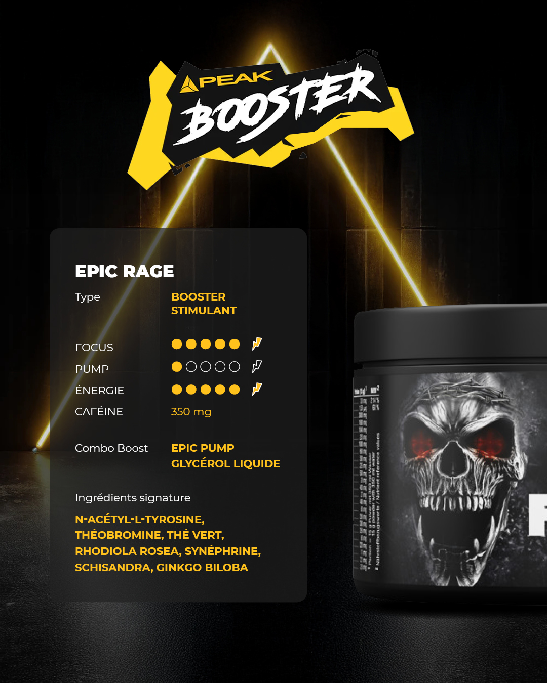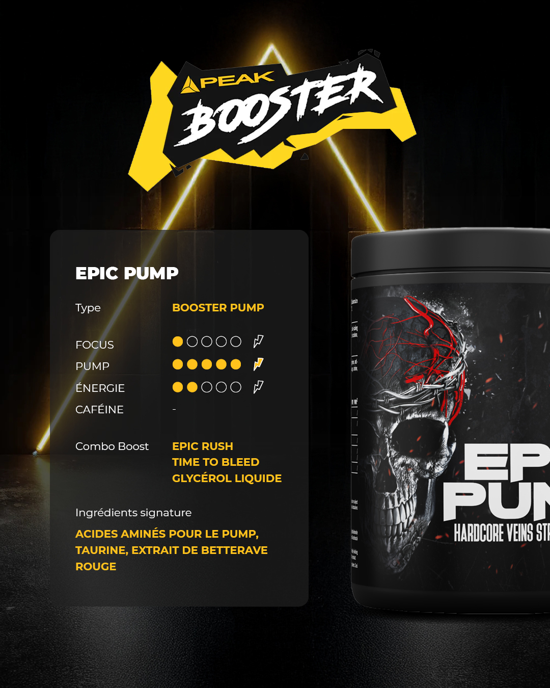 Légende : Focus / Pump / Énergie sont notés de 1 à 5 selon les visuels Peak (● = niveau rempli, ○ = niveau vide). Pour un booster sans caféine, privilégiez Epic Pump, Epic Pump Unlimited, Nootrepic, Fight IQ, Buffed Bullets et Liquid Glycerol.