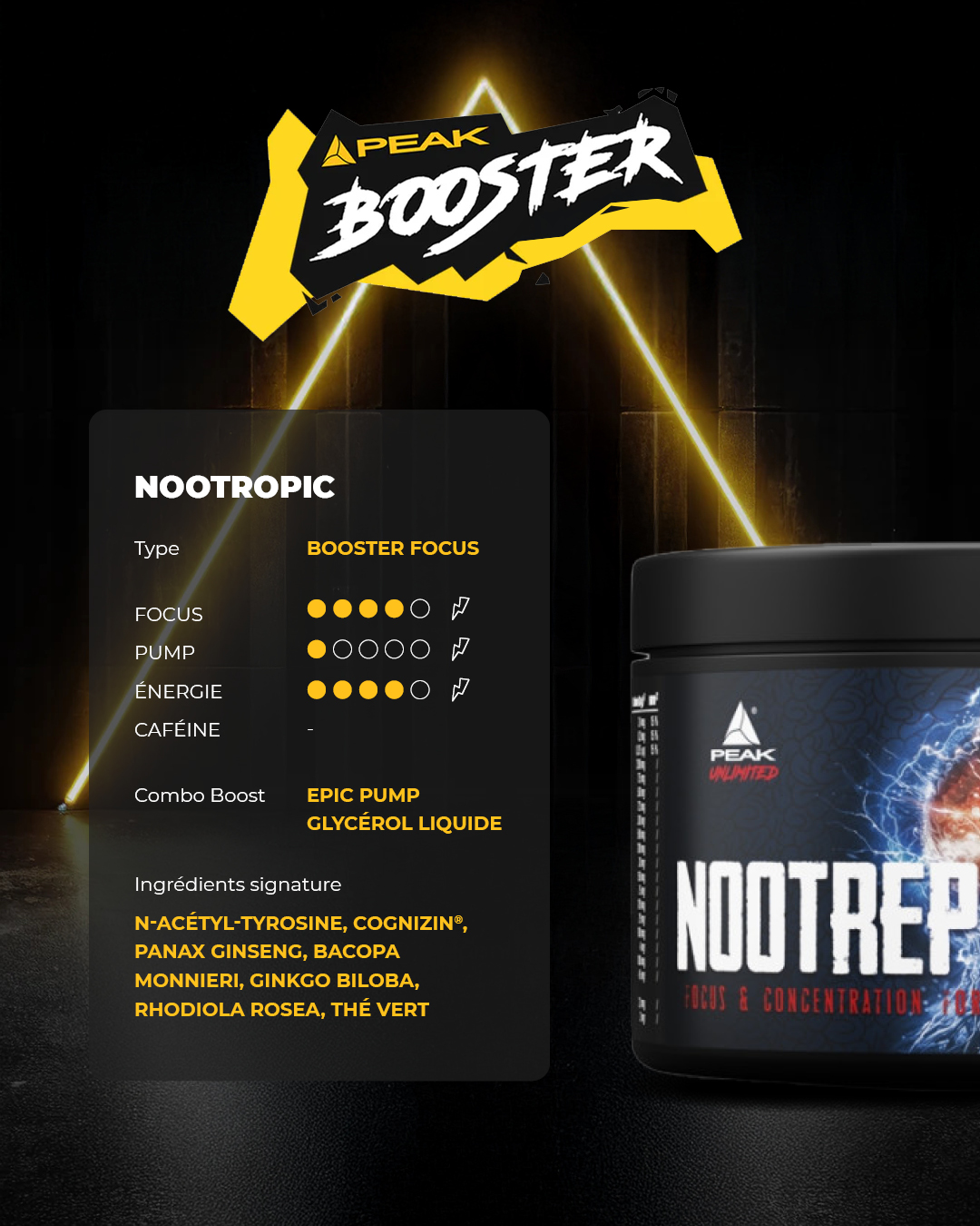 Nootrepic vise la concentration et la clarté mentale sans stimulants : intéressant si tu veux un booster sans caféine orienté focus, avec une approche “propre” (zéro excitation nerveuse).