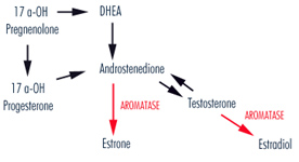 Simplification des voies hormonales impliquant la testostérone et l’aromatase.