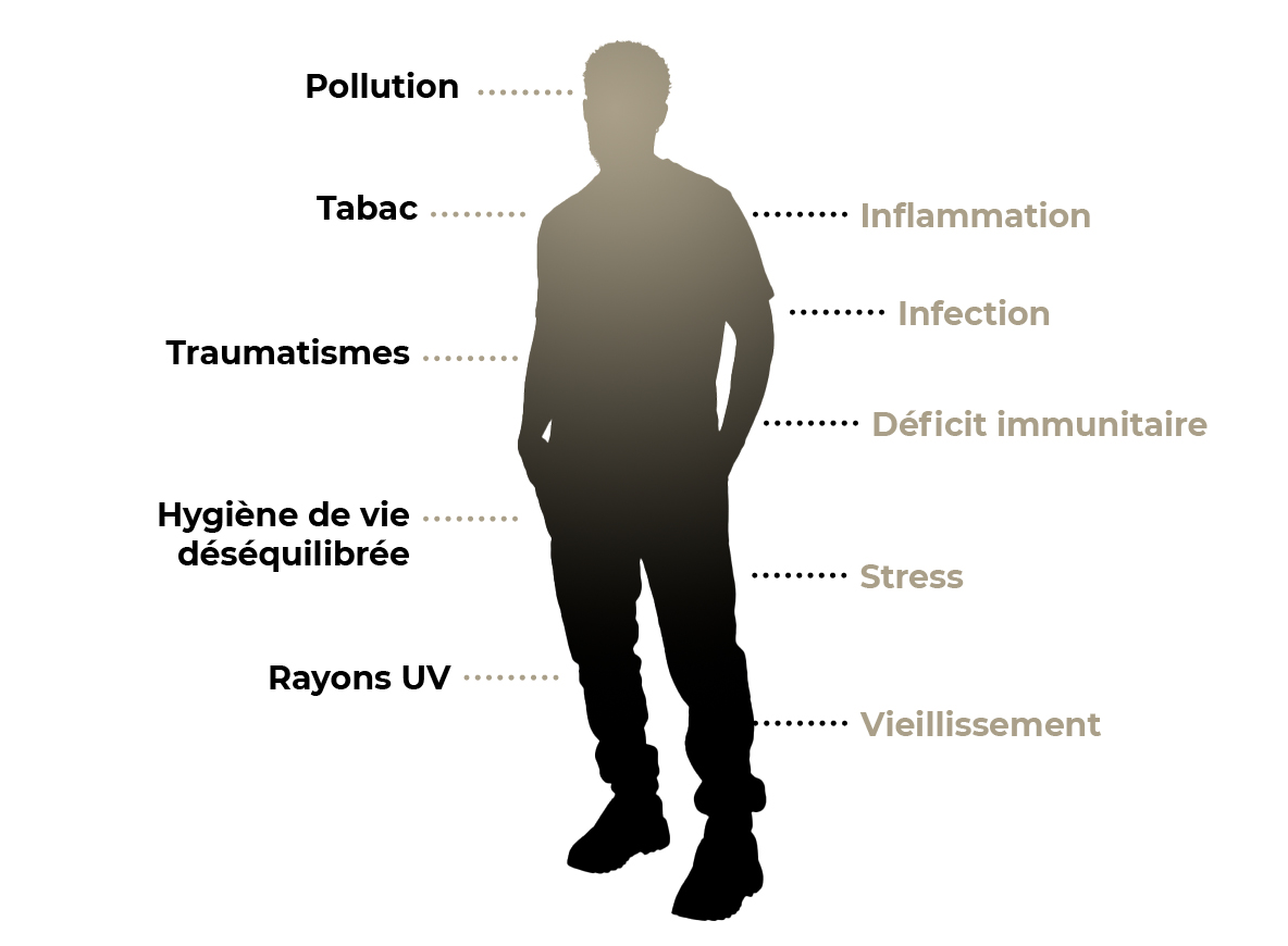 La société actuelle nous confronte à la pollution, l’absorption d’alcool ou de médicaments, l’exposition prolongée au soleil et au tabagisme qui sont d’autant de situations qui provoquent une surproduction d’EOA dans notre organisme. Ceci conduit à un affaiblissement de nos défenses antioxydantes (vitamines, oligo-éléments) mais également à l’apparition de dégâts cellulaires. De plus l'activité physique intense accentue ce stress oxydant.