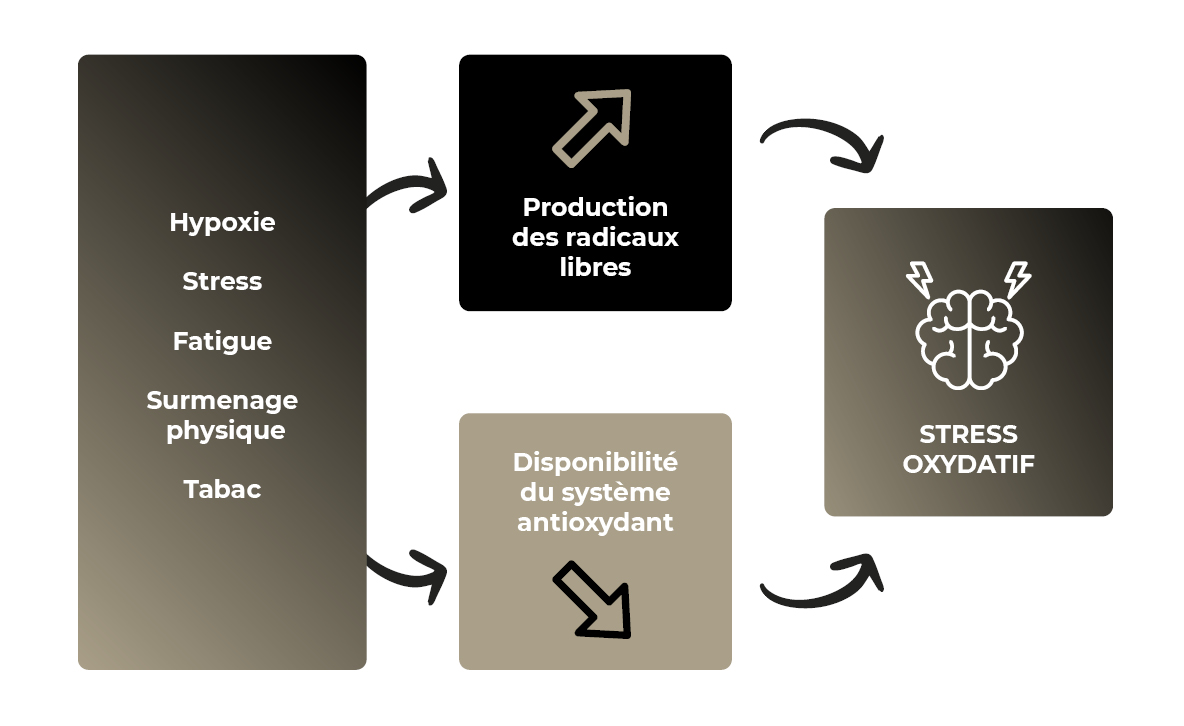 La notion de stress oxydant a été évoquée par Denham Harman lorsqu’il émit l’hypothèse que le vieillissement serait dû, en partie, à une accumulation de dommages moléculaires et cellulaires provoqués par des espèces oxygènes activées. En effet l’oxygène est normalement transformé en molécules d’eau au niveau de la chaîne respiratoire mitochondriale. Cette réaction est importante car elle apporte à la cellule toute l’énergie nécessaire sous forme ATP. Le processus n’est toutefois pas parfait car une faible partie de l’oxygène (2 à 5%) est convertie en espèces oxygénées activées (EOA)particulièrement réactives. Le stress oxydant se définira donc comme un déséquilibre de la balance entre la formation d’EOA à caractère pro-oxydant et les antioxydants qui régulent leur production, en faveur des premières. Les EOA pourront dès lors s’attaquer à toute une série de substrats biologiques importants avec comme conséquence la destruction de protéines, l’apparition de cassures au sein de l’acide désoxyribonucléique (ADN) et l’altération de la membrane cellulaire via l’induction de phénomènes de peroxydation lipidique.