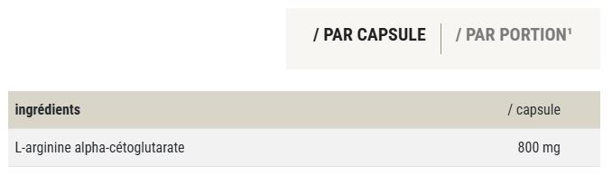 L-arginine alpha-cétoglutarate (86 %), enveloppe de la capsule (gélatine bovine), antiagglomérant (sels de magnésium d'acides gras, sels de calcium d'acide orthophosphorique).