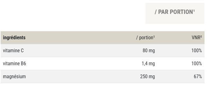Sels de magnésium de l'acide citrique (40%), acidifiants (acide citrique, acide malique), inuline, bicarbonate de sodium, arôme, acide ascorbique, édulcorants (acésulfame-K, sucralose), colorant (extrait de carmin), chlorhydrate de pyridoxine.