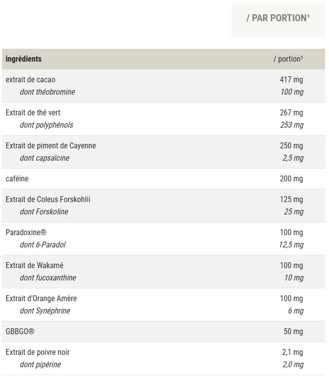 Extrait de cacao (fruit), extrait de thé vert (feuille), extrait de poivre de Cayenne (fruit), caféine, enveloppe de la capsule (hydroxypropylméthylcellulose), extrait de Coleus Forskohlii (racine), extrait de graines de paradis (graine) (Paradoxine®), extrait de wakame ( feuille), extrait d'orange amère (fruit), chlorhydrate de gamma-butyrobétaïne (GBBGO®), antiagglomérant (sels de magnésium d'acides gras), extrait de poivre noir (fruit).